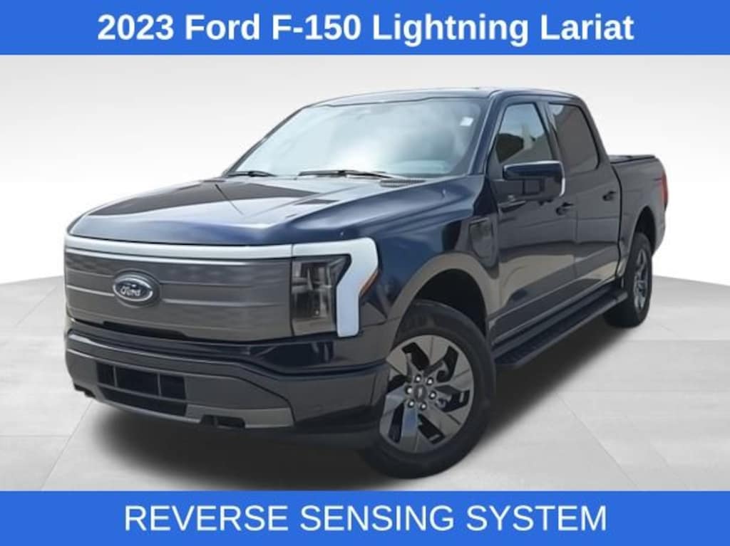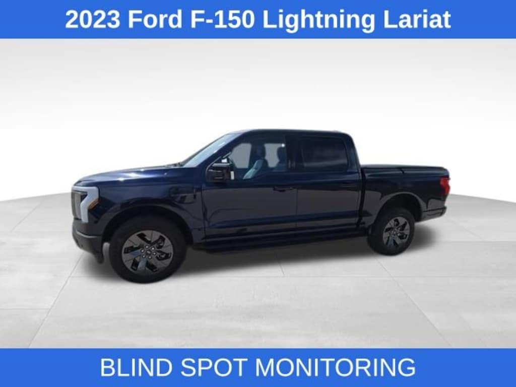 Antimatter Blue Metallic 2023 Ford F-150 Lightning CARFAX One-Owner. Clean CARFAX. 76/61 City/Highway MPG REVERSE SENSING SYSTEM, HEATED AND COOLED LEATHER SEATS, SYNC VOICE ACTIVATED SYSTEM, BLIND SPOT MONITORING, RUNNING BOARDS, REMOTE STARTER, REAR VIEW CAMERA, REMOTE KEYLESS ENTRY, HEATED STEERING WHEEL, LANE KEEPING SYSTEM, Equipment Group 510A Standard, Heated door mirrors, Heated front seats, Navigation System, Soft Folding Tonneau Pickup Box Cover, Wheels: 20" Alloy Dark Carbonized Gray.